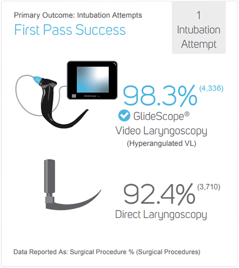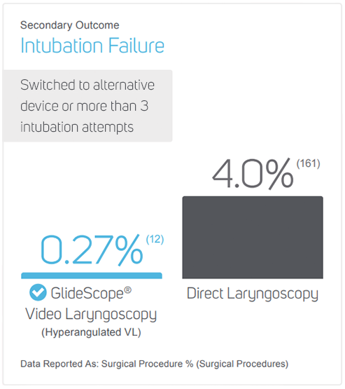 Data from this groundbreaking trial included 8,429 procedures, and results demonstrated that, in comparison to DL for initial approach, procedures that utilized GlideScope® hyperangulated VL showed increased first pass success rates, reduced repeated intubation attempts and intubation failures, with no increase in dental or airway injuries. This overall reduction in intubation attempts is clinically relevant, as repeated intubations are associated with higher risks for patient harm.5